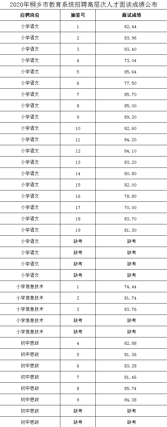 2020年桐乡市教育系统招聘高层次人才面谈成绩公布