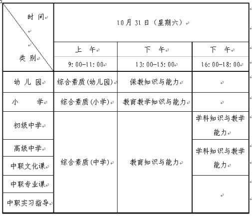 (一)全国中小学教师资格考试(笔试)日期为2020年10月31日,具体时间安排如下: