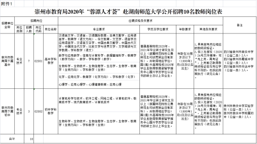 附件:1.崇州市教育局2020年“蓉漂人才荟”赴湖南师范大学公开招聘10名教师岗位表