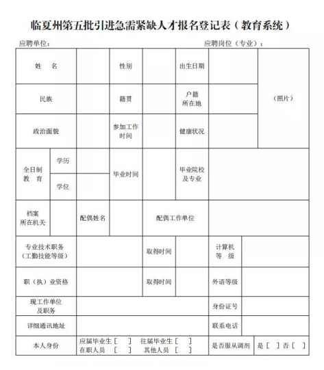 2.临夏州第五批引进急需紧缺人才报名登记表(教育系统)