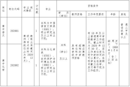 为进一步加强我校教师队伍建设,优化师资结构,特面向社会公开招聘高中语文、化学教师岗位高级职称教师各1名。根据《事业单位人事管理条例》(第652号国务院令)、《事业单位公开招聘人员暂行规定》(原人事部第6号令)、《安徽省事业单位公开招聘工作人员暂行办法(试行)》(皖人社发〔2010〕78号)等文件精神,现将有关事项公告如下。