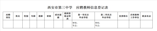 1.请将个人简历(附近照)和各类证书复印件(学历证、教师资格证、职称证、获奖证书等)装订,面投西安市三中办公室并填写《应聘教师信息登记表》。
