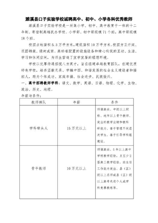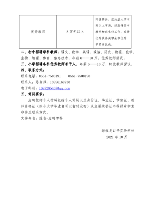 安徽省淮北市濉溪县口子实验学校诚聘高中、初中、小学各科优秀教师公告