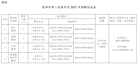贵阳市第三实验中学是贵州省一类示范性高中,学校秉承“刚健自强,止于至善”的校训精神,连续十四年获得贵阳市入出口评估一等奖。学校现有教职工217人,学生2400余人,为满足学校教育教学需求,现面向教育部直属6所师范院校应届公费师范毕业生及国内外高校全日制应届硕士研究生招聘教师,具体要求如下: