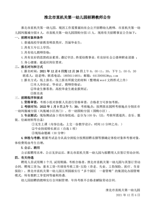 安徽省淮北市直机关第一幼儿园教师招聘公告