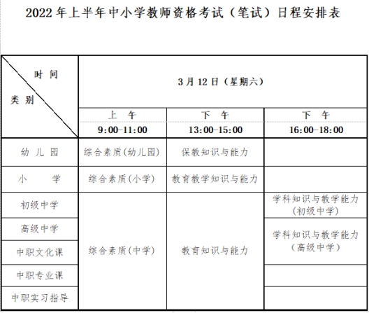 考试日期为2022年3月12日(周六),各科目笔试考试时间为120分钟。