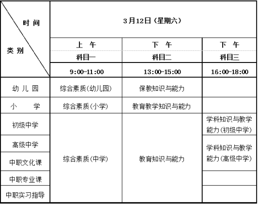 中小学教师资格考试(笔试)科目代码列表