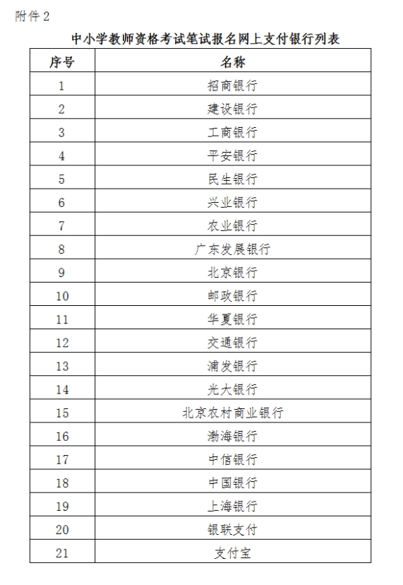 附件2:中小学教师资格考试笔试报名网上支付银行列表