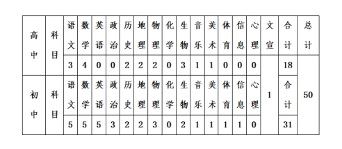 2022年我校教师招聘总人数为50人,各学科具体人数如下表所列: