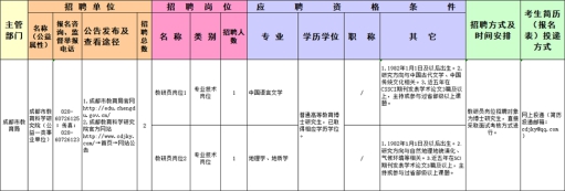 根据《成都市事业单位公开招聘工作人员办法》(成人社发〔2021〕26号)规定及所属事业单位用人需求,按照“公开、平等、竞争、择优”的原则,成都市教育局所属事业单位拟面向社会公开招聘2名高层次人才(详见附件1)。本次公开招聘进入事业单位的为编制内正式工作人员,招聘的工作人员按国家《事业单位人事管理条例》及相关规定,实行事业单位聘用制管理。现将有关事项公告如下(本公告在市教育局官网、招聘单位官网发布):