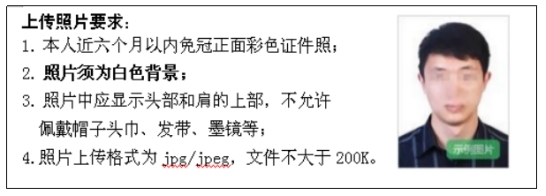 2.上传照片:照片将用于准考证以及考试合格证明,请考生上传照片时慎重选用。照片不合格的考生审核将不能通过。