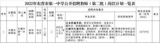 招聘数学教师2人。招聘岗位、条件等具体要求见《东营市第一中学2022年公开招聘教师(第二批)岗位计划一览表》(附件1)。