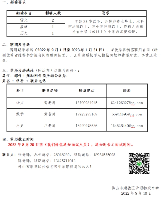 佛山市顺德区沙滘初级中学2022学年第一学期临聘教师招聘公告