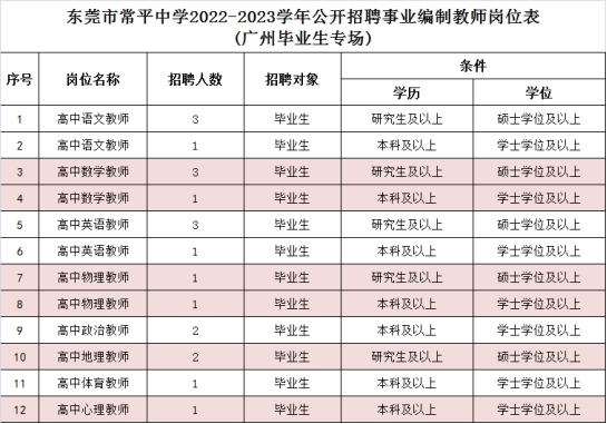 作为办学规模最大的市属公办高中,东莞市常平中学为满足市政府教育“扩容提质”发展要求,2022年9月广州场应届毕业生招聘专场需要招聘优秀应届毕业生20名。招聘岗位计划如下: