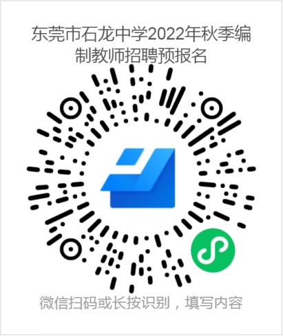 请有意向报考东莞市石龙中学的预报名人员,点击以下链接或识别二维码,在截止填报时间9月14日中午12点前,填报个人预报名信息。