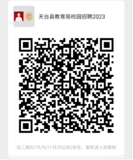 报名信息提交成功的考生,请扫描右边二维码加入“天台县教育局校园招聘2023”微信群,并将群昵称修改为“报考学科+姓名”,如“高中语文张三”,随时关注群里的信息。