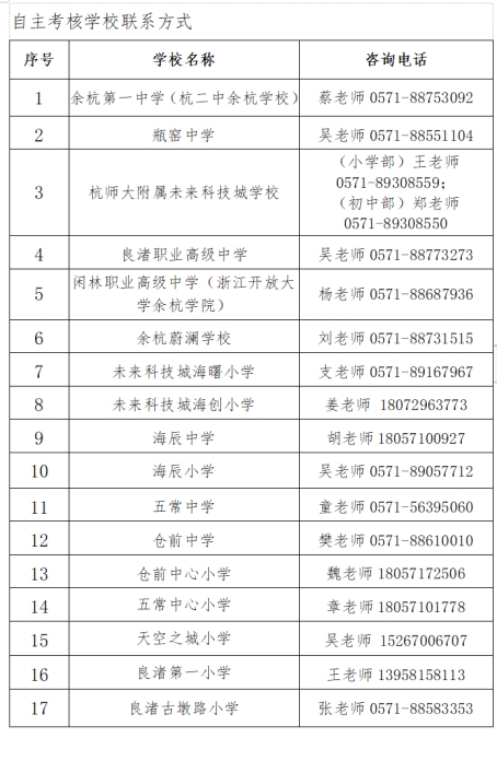 1.学校名单:余杭第一中学(杭二中余杭学校)、瓶窑中学、良渚职业高级中学、闲林职业高级中学(浙江开放大学余杭学院)、杭师大附属未来科技城学校、五常中学、五常中心小学、仓前中学、仓前中心小学、天空之城小学、余杭蔚澜学校、未来科技城海创小学、未来科技城海曙小学、海辰中学、海辰小学、良渚第一小学、良渚古墩路小学、凤凰小学、闲林中心小学、中泰中心小学、径山镇潘板中心小学。