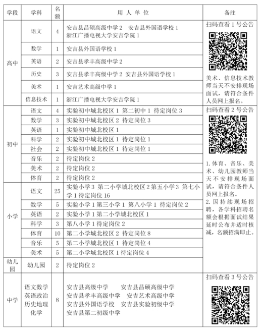 2.详情请扫码查询《浙江省安吉县招聘2023年教师公告(第1号)》《浙江省安吉县招聘2023年教师公告(第2号)》《浙江省安吉县招聘2023年教师公告(第3号)》。