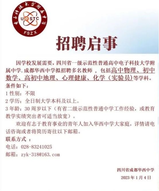 欢迎你加入历史悠久、环境优雅、设施先进、师资雄厚的百年名校成都华西中学,以下是学校本次招聘启事。