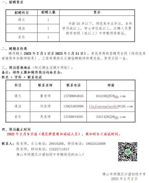佛山市顺德区沙滘初级中学急招语文、道法、音乐临聘教师各1名
