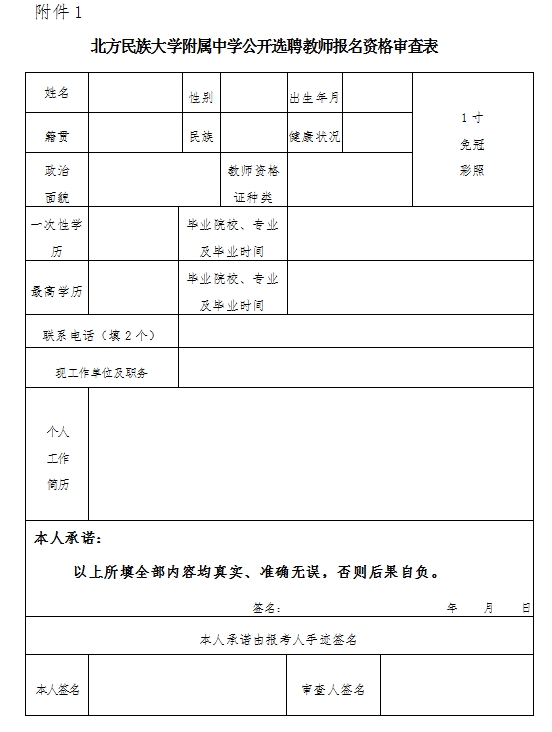 1、报名方式:有意应聘者,请将个人应聘材料以电子邮件的形式发送至北方民族大学附属中学校办公室。注意预留本人联系方式,初选合格后,学校通知本人到校面试并进行相关考核。
