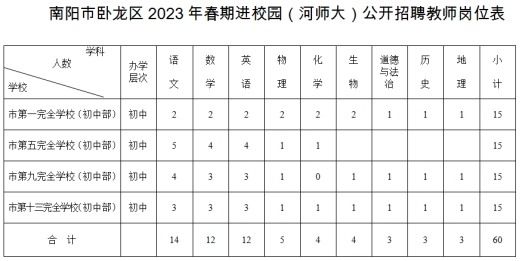 进校园公开招聘教师60名。具体岗位详见《南阳市卧龙区2023年春期进校园(河师大)招聘教师岗位表》(见附件1)。