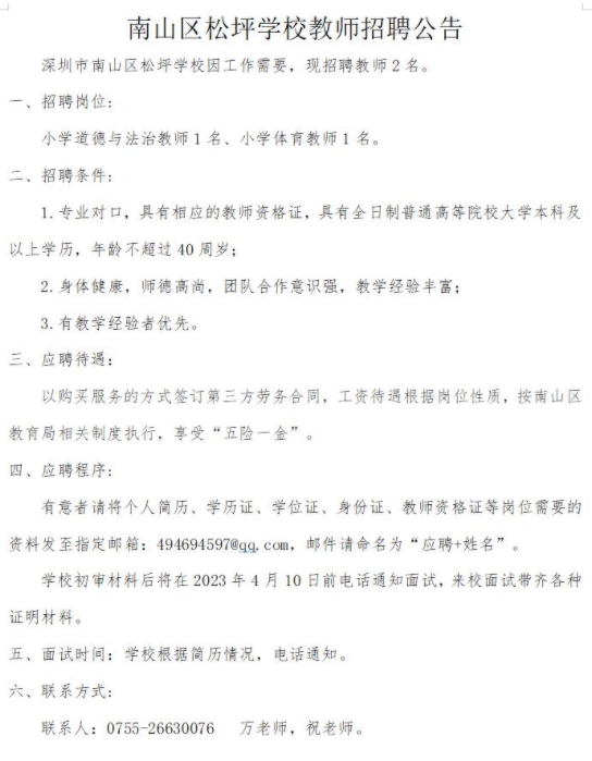2023年广东省深圳市南山区松坪学校教师招聘公告