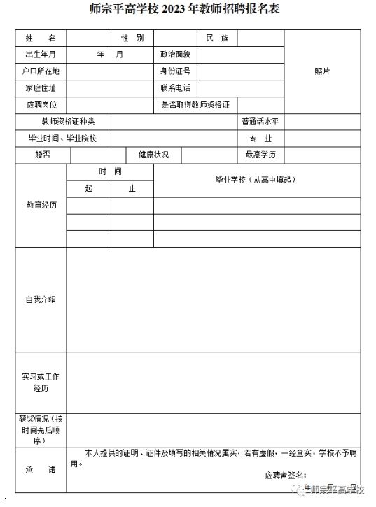 1.简历投递:即日起,把简历、报名表(参照文末样式制作)、相关学历证书、表扬奖励等材料打包发送至师宗平高学校邮箱(邮箱号:qjshizongpgxx@163.com;361661332@qq.com);邮件标题统一以“姓名+毕业院校+应聘岗位”格式命名。报名截止日期为2023年7月5日17::00。