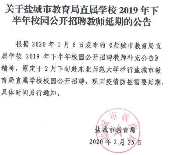 江苏省盐城市教育局直属学校2019年下半年校园教师招聘延期的公告