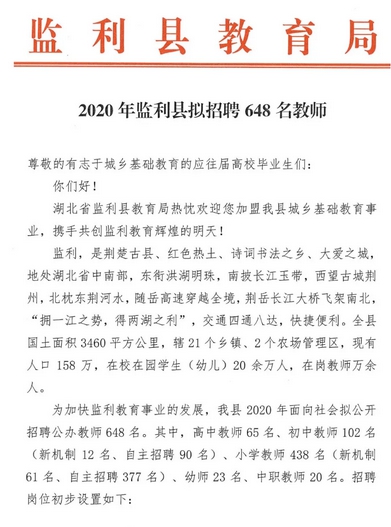 2020年湖北省荆州市监利县拟教师招聘648名公告