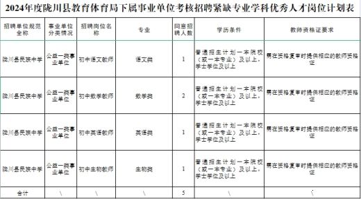 根据《关于同意县教育体育局党组使用编制通知单》(陇机编办准[2023]4号)、《陇川县人力资源和社会保障局关于印发2024年教育卫生部门考核招聘紧缺专业学科优秀人才工作方案的通知》陇人社发〔2024〕2号文件,同意陇川县民族中学招聘教师5人,招聘岗位属正式在职在编专业技术人员。为认真做好2024年考核选优工作,现将相关事宜公告如下: