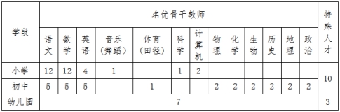 为推进人才强区、人才兴教战略,实施名师工程,经研究决定面向社会公开选聘特殊人才和名优骨干教师80名,其中特殊人才13名(含幼儿园3名),名优骨干教师67名(含幼儿园教师7名、小学教师32名、初中教师28名)。