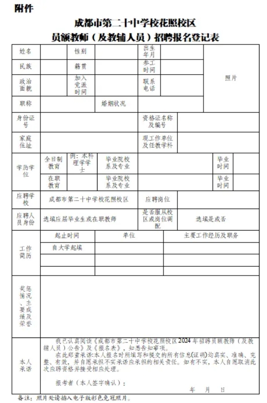 附件:成都市第二十中学校花照校区员额教师(及教辅人员)招聘报名登记表