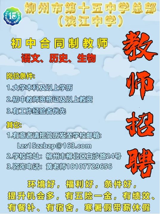 2024年广西柳州市第十五中学总部(滨江中学)教师招聘公告