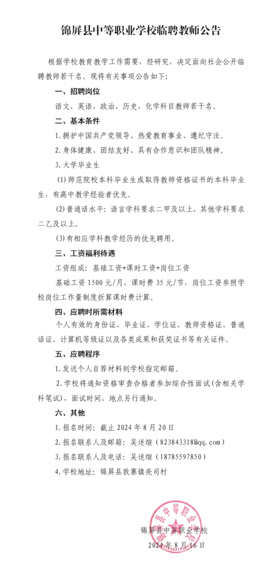 2024年贵州省黔东南州锦屏县中等职业学校临聘教师公告