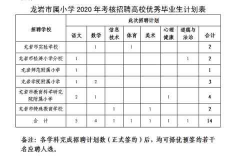 4.任职条件:详见《龙岩市属小学2020年考核招聘高校毕业生岗位表》(附件1)。