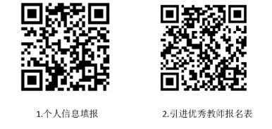 请用微信扫描下方“1.个人信息填报”二维码在线填报相关信息,扫描下方“2.引进优秀教师报名表”二维码,下载并填写完整后,并携带身份证、毕业证书、所获荣誉与其它能说明个人业绩的材料原件与复印件参加现场报名。