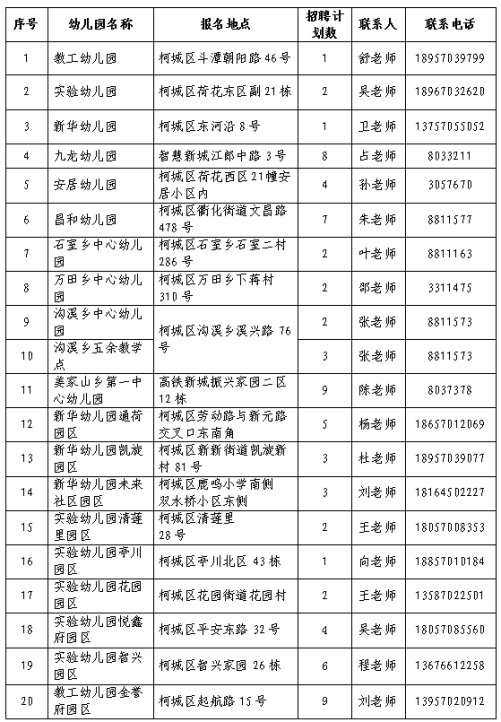 柯城区公办幼儿园秋季招聘保育员110名。具体计划如下: