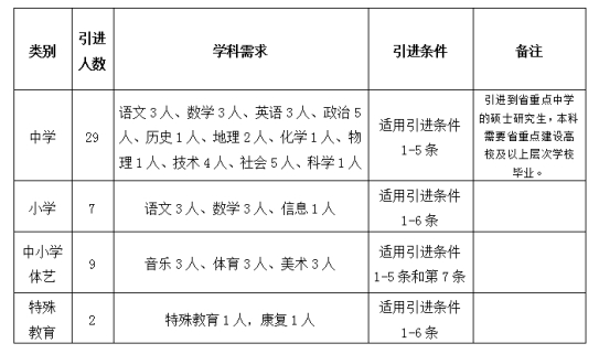 7.美术、音乐学科引进条件放宽至:教育部确定的独立设置的本科艺术院校和教育部批准参照独立设置本科艺术院校招生的部分艺术类相关专业全日制本科应届毕业生,且在校期间多次获得学业奖学金(学期3次以上或学年2次以上),或有校级优秀毕业生、三好学生及以上荣誉的。