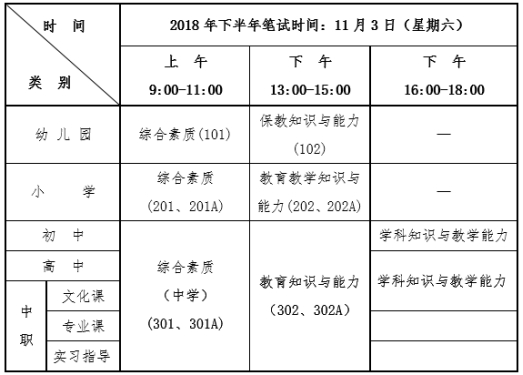 根据教育部教师工作司和考试中心统一部署及浙江省教育厅有关文件精神,现将我省2018年下半年中小学教师资格考试笔试工作安排公告如下: