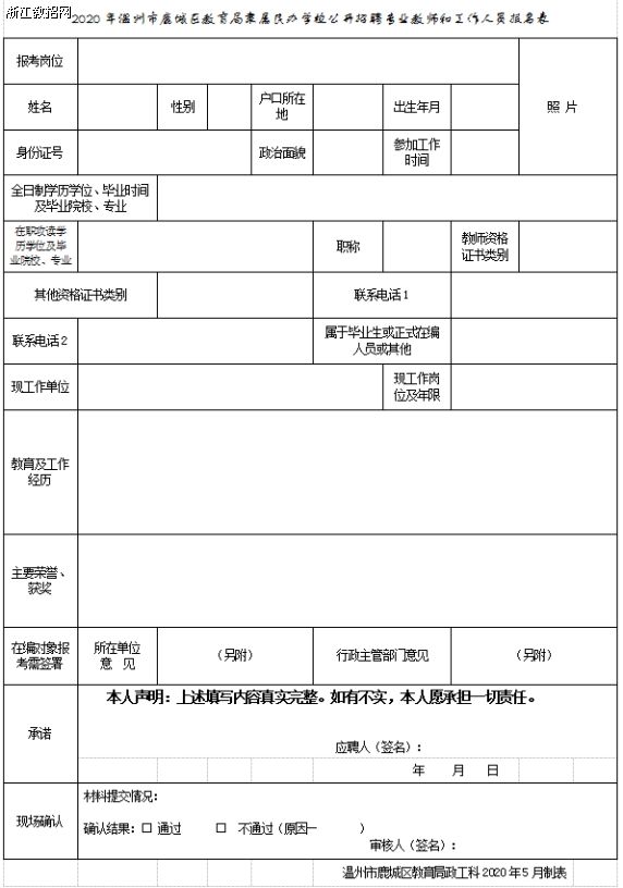 2.2020年温州市鹿城区教育局直隶属民办学校公开招聘专业教师和工作人员报名表