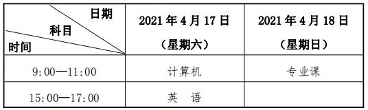 (四)考试时间。全省统一考试时间为 2021 年 4 月 17 日至 18 日。具体考试时间与考试科目安排如下(北京时间):