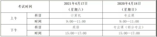 4.考试时间。全省统一考试时间为2021年4月17日至18日。具体考试时间与考试科目安排如下(北京时间):