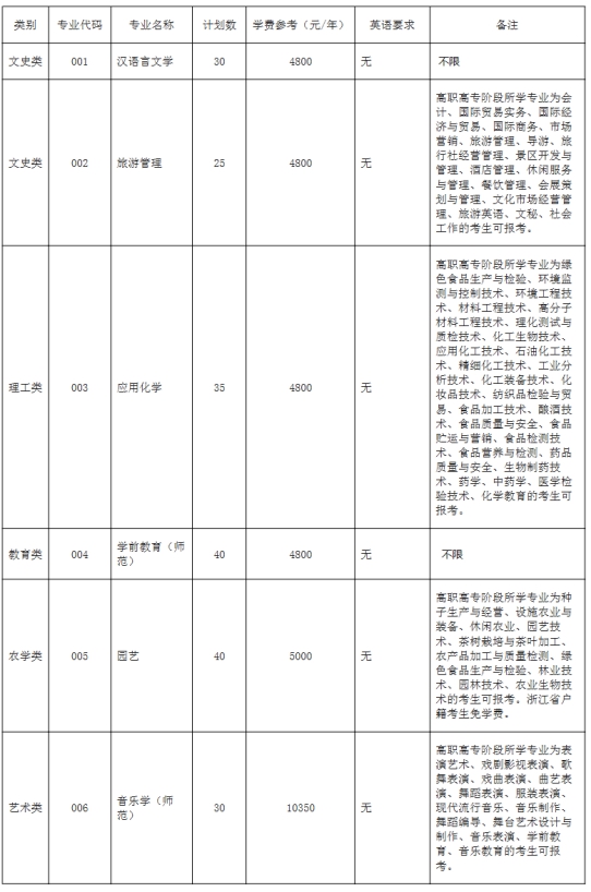 丽水学院2021年普通高校专升本招生计划
