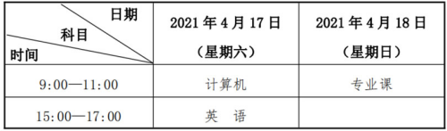 (四)考试时间。全省统一考试时间为2021年4月17日至18日。具体考试时间与考试科目安排如下(北京时间):