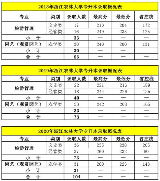 2018-2020年浙江农林大学专升本录取概况表