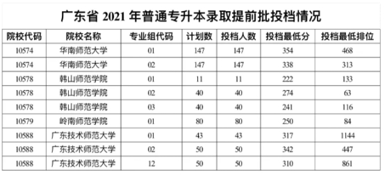 广东省2021年普通专升本录取提前批投档情况