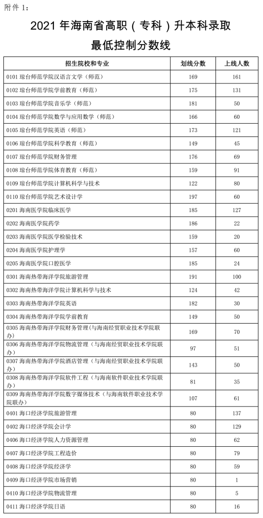 我省高职(专科)升本科招生录取分数线在考生成绩不低于80分的基础上,按照招生学校各专业计划数1:1比例从高分到低分划定。其中“退役大学生士兵”和“建档立卡贫困家庭毕业生”两个专项计划录取最低控制分数线为划定相应专业录取分数线下20分(详见附件1)。考生成绩不低于划定报考学校相应专业的最低录取控制分数线,则确认为所报考学校相应专业预录取的考生,考生也可向报考学校查询本人的预录取信息。