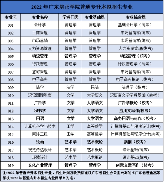 普通专升本圆了众多专科院校毕业生的升学梦,根据《广东省2022年普通高等学校专升本招生工作规定》的相关要求,我校2022年拟招生专业为19个,招生专业涵盖管理学、法学、文学、工学、艺术学等五个学科门类。我校2022年普通专升本拟招生专业具体如下: