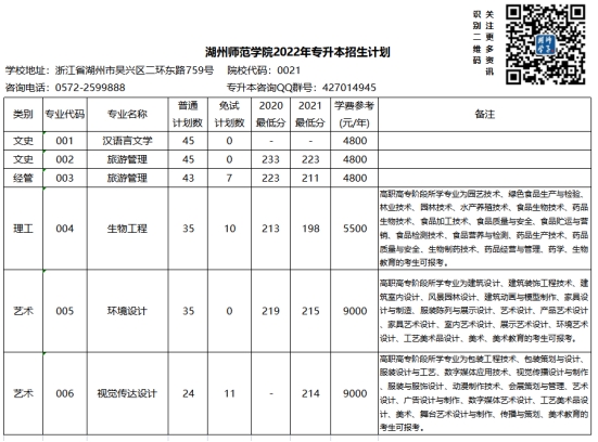 2021年湖州师范学院专升本招生计划及历年录取情况
